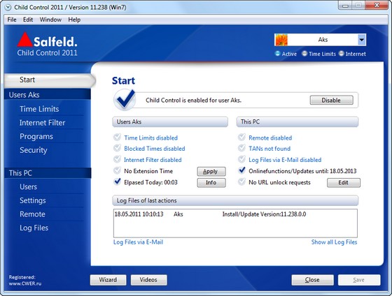 Salfeld Child Control - программа ограничивает время, проводимое вашими детьми за компьютером, как только выделенное им время закончится, компьютер автоматически выключится и повторный вход будет возможен только после ввода пароля. Ограничение можно ввести как по общему времени (например, не более 1 часа в день), так и по периоду времени, когда можно работать (например, с 22:00 до 8:00 доступ запрещен). Кроме этого, программа позволяет запретить посещение нежелательных сайтов, а также заблокировать доступ к определенным дискам и папкам.