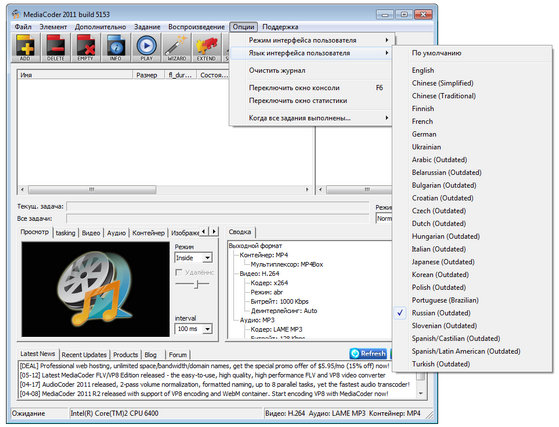 MediaCoder - позволяет повысить компрессию видео и аудио с целью уменьшения размеров файла, может извлекать аудиотреки, предоставляет возможности для конвертирования видео в нормальные VCD/DVD, может осуществлять конвертирование аудио без заметной потери качества, способен создавать копии CD "на лету" и многое другое.