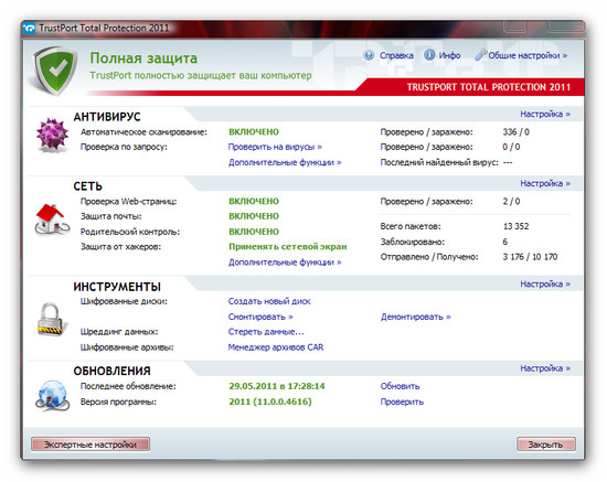 TrustPort Total Protection 2011 - максимальная защита для вашего компьютера от вредоносных программ, интернет-угроз и кражи конфиденциальных данных. Программа защищает компьютер от вирусов и шпионского ПО на всех точках доступа. Вся электронная почта и веб-сайты проверяются с целью выявления опасных программ или нежелательного контента. Предоставляет надежную защиту конфиденциальных данных путем шифрования и безопасного удаления конфиденциальных данных, которые более не используются.