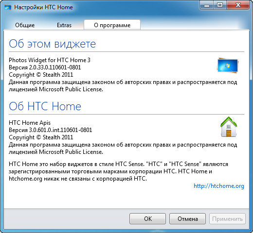 HTC Home Extras – это различные дополнения, которые расширяют функциональность виджетов. Это могут быть провайдеры погоды, ресурсы и т.д. Для установки дополнений, просто перетащите их на исполняемый файл любого виджета (Clock.exe, Weather.exe). Удалить их вы можете в настройках, на вкладке Extras.