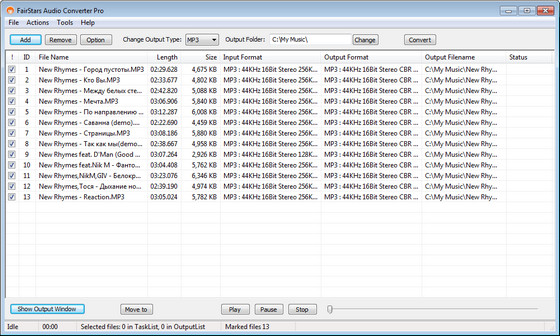 FairStars Audio Converter Pro - профессиональный инструмент для конвертации аудио файлов самых разнообразных форматов (WAV, RealMedia (RM, RA, RMVB, RMJ), AIFF, AU, Creative VOC, PVF, PAF, Amiga IFF/SVX, APE, FLAC, OGG, VQF, MP1, MP2, MP3, WMA, WMV, ASF, MP4, M4A, M4B, AAC to WMA, MP3, AAC, VQF, OGG, FLAC, APE, WAV). Кроме этого утилита позволяет нормализовать композиции по звучанию, улучшить качество воспроизведения, имеет встроенный плеер и позволяет редактировать ID3 теги.