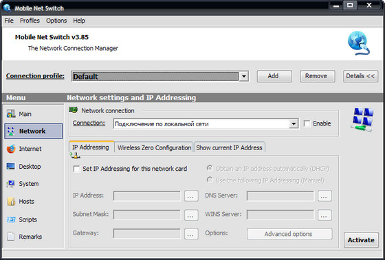 Windows слабо приспособлена для работы с несколькими сетевыми подключениями одновременно, и необходимость менять опции интернет-соединения вручную каждый раз, когда вы хотите перейти с локальной сети на ADSL-модем, мягко говоря, неудобно. Еще хуже обстоят дела у мобильных пользователей, которые постоянно в движении и вынуждены заново настраивать параметры подключения к интернету, sharing и т.д. на каждом новом месте. Mobile Net Switch позволит с легкостью избавиться от всех этих неудобств. Программа умеет работать с неограниченным числом интернет-профилей и мгновенно переключаться между ними без перезагрузки ПК. Остается только внести необходимые данные (IP-адрес вашего ПК, интернет-шлюз, координаты DNS-серверов и т. д.) для каждого из профилей и навсегда забыть о подобных проблемах.