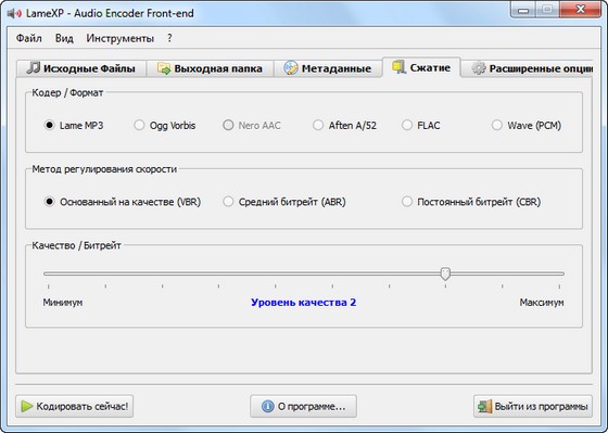 LameXP - это небольшая утилита, которая позволяет производить перевод аудио в форматах Wave, MP3, Ogg Vorbis, AAC/MP4, FLAC, WavPack, Musepack, Speex и APE в MP3, OGG и AAC. Для этого используются бесплатные кодеки соответственных форматов. Поддерживается пакетная обработка файлов, реализована возможность вносить информацию в теги, а также присутствуют все необходимые опции для управления качеством выходных файлов.
