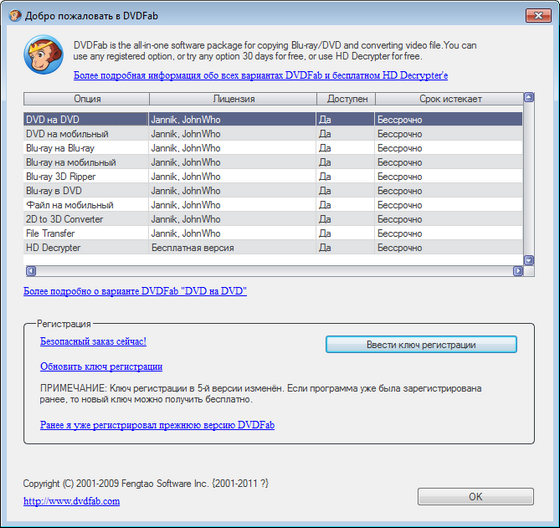 DVDFab – мощный, многофункциональный программный продукт для копирования DVD дисков с возможностями гибкой обработки видеопотока. Программа является одной из лучших на сегодняшний день, из инструментов для копирования, разбиения, пережатия и конвертирования DVD дисков с фильмами. Снимает все защиты и ограничения с диска и при желании пережмет диск большой емкости и вместит его в обыкновенную пустую DVD болванку с минимальными потерями качества (DVD9->DVD5) или разобьет фильм на два диска с полным переносом его меню, удалит всю рекламу, запишет только фильм и многое другое. Программа имеет интуитивно понятный, мультиязычный интерфейс включая русский.