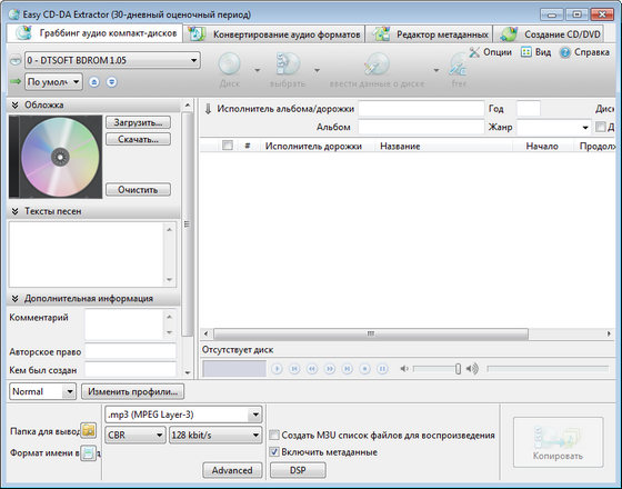 Easy CD-DA Extractor - программа для преобразования аудио-CD в качественные цифровые аудиофайлы, а также для записи MP3, WAV MP4, Windows Media Audio, FLAC, Ogg Vorbis, AAC и Monkey-s файлов на аудио-CD. Допускается преобразование аудиотреков непосредственно в MP3, WMA, VQF, OGG или WAV и конвертирование из одного аудиоформата в другой.