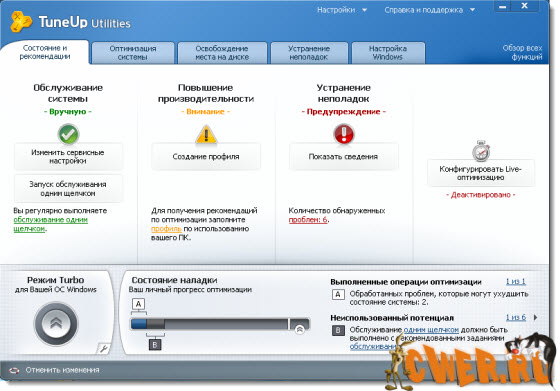 TuneUp Utilities 2011 - новая версия большого набора всевозможных инструментов для настройки и оптимизации системы. При помощи этой программы вы сможете очищать диски от мусора, удалять неверные записи из системного реестра и дефрагментировать его, оптимизировать оперативную память, управлять автозагрузкой, навсегда удалять файлы с диска при помощи специальной утилиты ”TuneUp Shredder” (дальнейшее восстановление становится невозможно даже при помощи специальных программ), восстанавливать удаленные файлы, изменять внешний вид Windows, и многое другое.