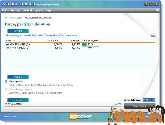 Secure Eraser - основное предназначение программы - удаление конфиденциальной информации пользователя с жесткого диска без возможности восстановления. Программа сразу после удаления информации перезапишет освободившиеся секторы несколько раз производной комбинацией символов, так что для восстановления информации понадобятся специальные аппаратные средства.