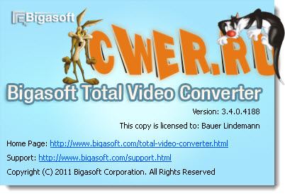 Bigasoft Total Video Converter - мощный видеоконвертер, позволяющий конвертировать практически любые видеофайлы в различные форматы. Программа распознает свыше 40 видео и аудио форматов и поддерживает конвертирование между свыше 30 форматами (AVI, Xvid, DivX, H.264, MP4, 3GP, MKV, WMV, RM, FLV, MOV, WebM, VP8, 720p, 1080p, 1080i HD, AVCHD видео и многими другими). Также программа имеет встроенный мощный алгоритм преобразования медиафайлов благодаря которому можно конвертировать их с очень высокой скоростью. Это также и мощный аудиоконвертер, способный конвертировать между MP3, AAC, AC3, WAV, WMA, и т. д. Кроме того, он может извлекать аудио из видео. Поддерживает конвертирование видео для большинства цифровых устройств, включая IPod, iPhone, BlackBerry, Apple TV, Zune, PSP, PS3, Pocket PC, Creative Zen, Xbox, Archos и других.