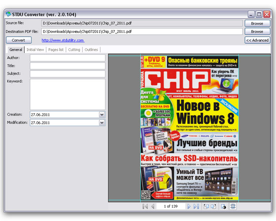 STDU Converter - конвертор DjVu в PDF всего в два клика. Вы можете конвертировать только часть книги или ее целиком, а так же выстроить свое дерево документа на выходе. Пользоваться чрезвычайно просто, - находите документ в DjVu или TIFF формате и нажимаете кнопку "Старт", и Все! Не забудьте только, указать папку куда вы будите складывать готовые PDF файлы.
