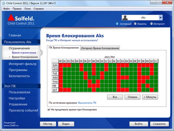 Salfeld Child Control - программа ограничивает время, проводимое вашими детьми за компьютером, как только выделенное им время закончится, компьютер автоматически выключится и повторный вход будет возможен только после ввода пароля. Ограничение можно ввести как по общему времени (например, не более 1 часа в день), так и по периоду времени, когда можно работать (например, с 22:00 до 8:00 доступ запрещен). Кроме этого, программа позволяет запретить посещение нежелательных сайтов, а также заблокировать доступ к определенным дискам и папкам.
