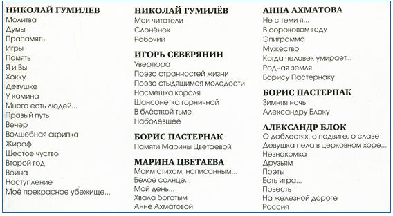 Авторы: Николай Гумилев, Игорь Северянин, Борис Пастернак, Марина Цветаева, Анна Ахматова, Александр Блок