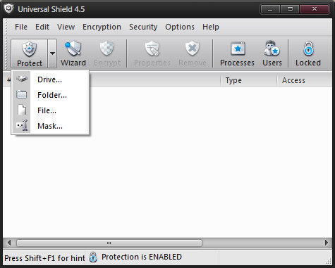 Universal Shield является комплексной программой, которая позволяет защитить паролем и легко предотвращать доступ к Вашим важным дискам, файлам, папкам и даже отдельным расширениям файлов. Программа поможет сделать информацию полностью невидимой, недоступной, или позволить доступ только для чтения. Защищенные папки не могут быть переименованы, изменены, удалены, скопированы, перемещены, и станут не замеченными для самой системы. Может быть заблокирован доступ к рабочему столу. Защита продолжает работать в безопасном режиме или даже после удаления программы.