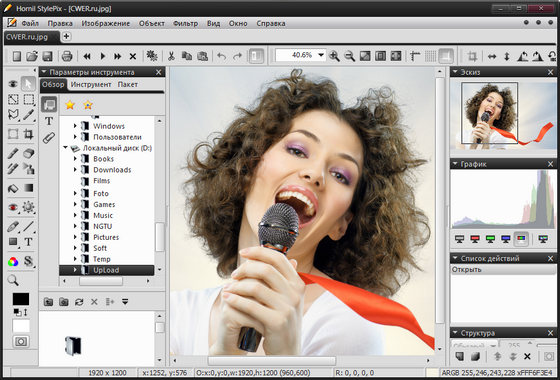 Hornil StylePix - программа, позволяющая ретушировать фотографии, изменять их размер, повернуть, провести цветокоррекцию, наложить текст, сделать фотоколлаж, вырезать, копировать и вставлять фотографии, применять различные фильтры, удалять эффект красных глаз и многое, многое другое. Имеет интуитивно понятный пользовательский интерфейс. Он предназначен для легкого и удобного управления отдельными функциями.