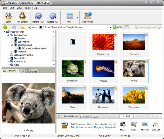 - В качестве отличной программы просмотра изображений и менеджера фотографий, ALSee – это легкая и быстрая программа, так что вы сможете быстро просмотреть и отредактировать ваши коллекции с фотографиями. Данная программа не сжимает, не архивирует и не упаковывает изображения для резервирования, потому что вы можете сделать гораздо лучше и быстрее с помощью ALZip.