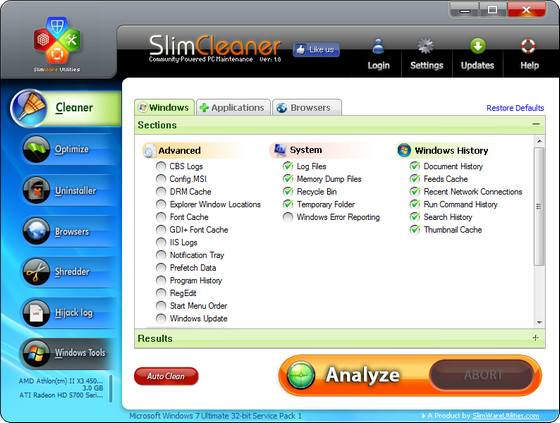 SlimCleaner - программа для очистки и оптимизации работы системы. Основной особенностью утилиты является поддержка пользовательских рейтингов в инструментах оптимизации системы и удаления программ, которые гарантируют быструю и точную оценку любого распространенного приложения (медиапроигрывателя, офисного приложения, браузера и антивирусного ПО). Приложение чистит систему от файлового мусора, временных файлах Windows, списках недавно открытых документов и других ненужных объектах. Также чистка проводится в папках, используемых Windows-приложениями для хранения собственных журналов истории.