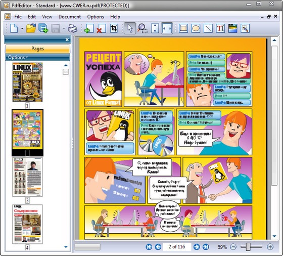 • Редактирование текста непосредственно в документе, изменение типа шрифта, размер, цвет, формат, масштаб и последствия редактировать, перемещать, удалять, вращать, копировать и вставлять, группы, якорь, согласования и зеркало текста, изображений и путей, изменение порядка страниц .