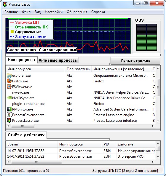 Windows, по умолчанию, позволяет программам полностью загружать центральный процессор, что ведет к зависанию системы и, соответственно, к неудобству работы. Технология ProBalance (Process Balance) программы Process Lasso аккуратно перераспределяет приоритеты запущенных программ, так что процессы, которые ранее загружали весь центральный процессор, больше не будут влиять на отклик системы.