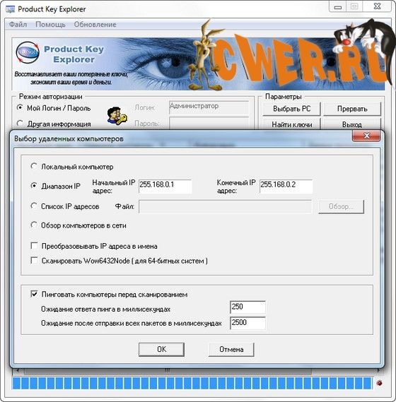После запуска программы достаточно будет нажать Find Keys и она сама просканирует реестр, и выдаст список программ, установленных на компьютере и регистрационные данные к нем. В программе есть окно для авторизации Администратора, если установлены ограничения на уровне пользователей. Может работать по сети с другими компьютерами и по заданному диапазону IP адресов или по списку IP в текстовом документе.