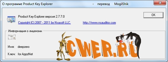 Product Key Explorer - позволяет расшифровать и увидеть, а также сохранить серийные номера (Product ID, Product Key, License Info, User Name, Company) продуктов Microsoft, CD-key установленных на компьютере программ, и не только их. Неполный список ПО, регистрационные данные которых можно увидеть и сохранить: Micrsoft Windows (2000, XP, 2003, Vista), Microsoft Office 2003, Microsoft Office 2007, Microsoft Office XP, Micrsoft Visual Studio 2005, Macromedia, Ahead Nero, Adobe Photoshop, CyberLink PowerDVD, Borland Delphi и т.д.