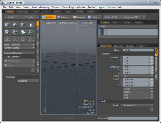 MODO - инновационная программа для 3D моделирования, рисования и рендеринга в единой рабочей среде. Особенностью программы является мощный, но при этом интуитивно понятный инструментарий для конструирования сложных геометрических форм методом подраздельных поверхностей. По прошествии нескольких лет продукт постепенно трансформировался в полноценный универсальный пакет. Интерфейс программы предлагает глубокую настройку практически всех рабочих элементов. Весьма востребованными будут предустановленные в нем навигационные стили, которые максимально приближают принципы взаимодействия с инструментами к методам, практикуемым в 3DS Max, Maya и других аналогичных решениях. Для удобства пользования все ключевые технологические переходы (рисование, анимация, рендеринг и т.д.) вынесены в отдельные модули.