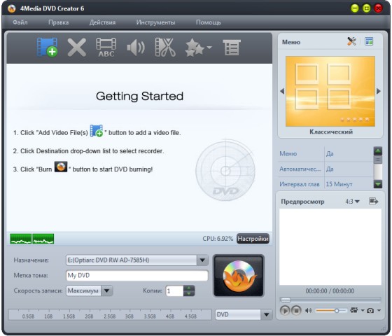 4Media DVD Creator - одна из лучших программ для создания DVD фильмов из разных видео файлов. Возможность просто записать на DVD MP4, MKV, AVI, MPEG, WMV, МТС, M2TS и так далее, сделать файл ISO образа. Это программное обеспечения позволяет записать DVD-диски с персональными меню и совместимо с большинством форматов дисков.
