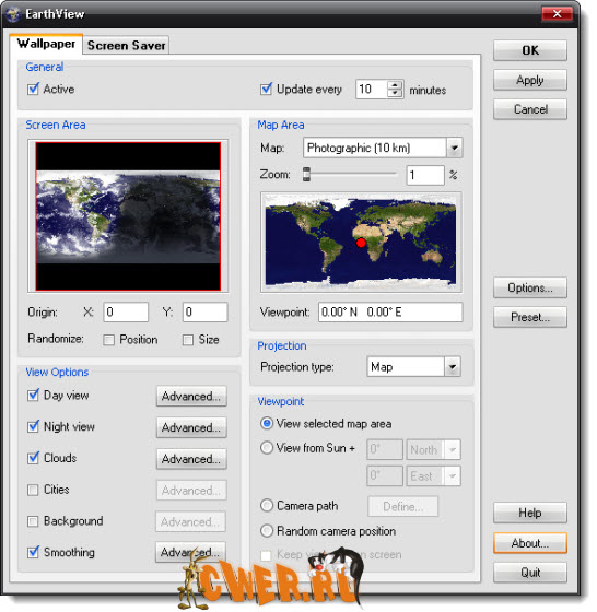 EarthView - это динамические обои и скринсейвер в виде карты нашей планеты или глобуса вращающегося синхронно с оборотом земли (поддерживает смену дня/ночи, облака, огни городов). EarthView может работать как скринсейвер, который создает высокодетализированные красивые виды земли (глобус или карта). Программу выделяют очень высокое качество изображения и насыщенные цвета. Все параметры генерации изображения гибко настраиваются, что позволяет подстроить качество изображения под производительность конкретного компьютера. С сайта разработчика можно скачать дополнительные (фотореалистичные) карты земной поверхности.