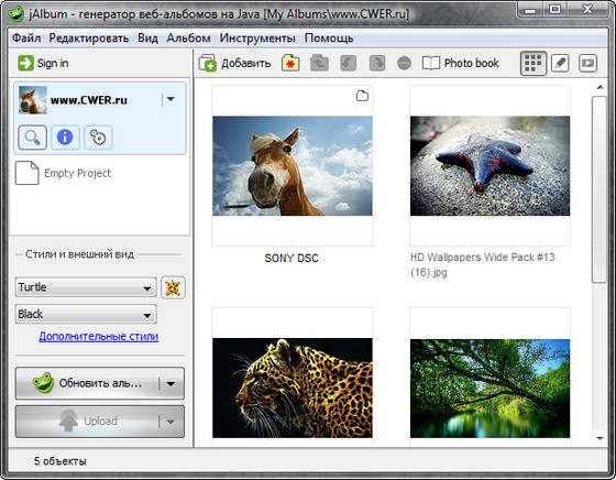 Jalbum - программа для автоматического создания веб-галерей. Для этого достаточно мышкой перетащить в окно программы папку с картинками, и она сгенерирует галерею с уменьшенными копиями изображений (или Slide-Show вариант). Впрочем, возможен и ручной режим работы с полным контролем над создаваемым проектом, в том числе с использованием имеющихся фильтров изображений, настройкой стилей, использованием данных IPTC/EXIF и т.п.