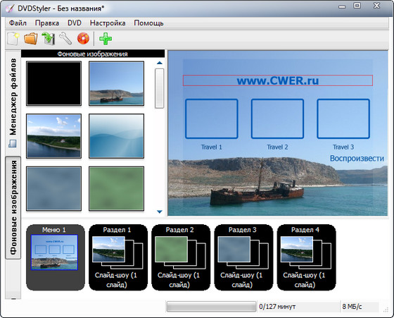 - импорт графических файлов для заднего фона DVD меню