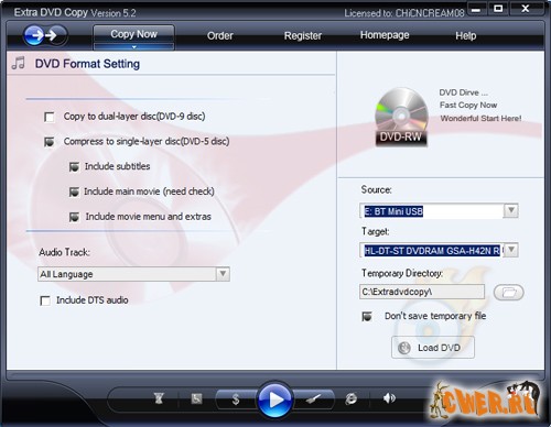 Extra DVD Copy - программа, которая, имея довольно дружественный интерфейс, позволяет делать все тоже, что и большинство подобных инструментов. Делает прямые копии DVD видеодисков DVD-5/DVD-9; пережимает с минимальными потерями качества большой DVD-9 видео в обыкновенную болванку DVD-5 (4.7ГБ); копирует DVD видеодиски с удалением рекламы и дополнительных модулей, или только фильм; копирует DVD видеодиски на жесткий диск без потери качества и т д.