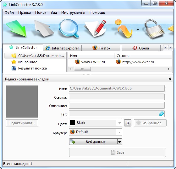 LinkCollector - менеджер закладок, поддерживающий все наиболее популярные браузеры, такие как Firefox, Opera, IExplorer. Программа позволяет синхронизировать закладки между разными браузерами и компьютерами, может быть размещена на USB-диске а также не записывает никаких файлов в системные папки и не записывает никакие данные в реестр Windows. Приятный, интуитивно понятный интерфейс позволит быстро выполнить нужную операцию над закладками. LinkCollector Portable Edition позволяет добавить, удалять и редактировать закладки, искать дубликаты, проверить ссылки на существование, удалить не существующие, быстро открыть ссылку в разных браузерах (Firefox, Opera, IExplorer, Mozilla, Netscape), а также захватить ссылку из браузера с которым Вы в данный момент работаете.