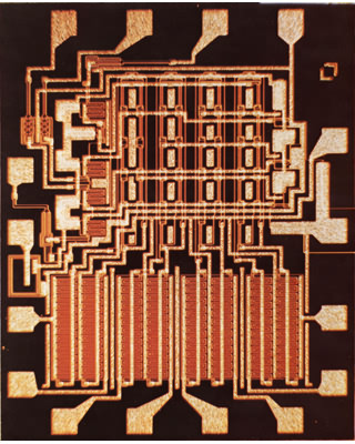 Кристалл первой «современной» микросхемы (1960 г.) — триггера с 4 транзисторами и 5 резисторами.