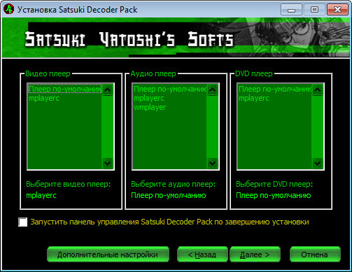 Satsuki Decoder Pack – содержит большое количество кодеков, необходимых для просмотра видео и прослушивания аудио, а также утилит, которые могут потребоваться вам для просмотра цифровых фильмов и роликов.