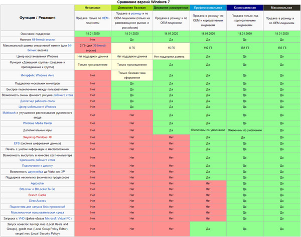 Сравнение редакций Windows 7 (для увеличения нажмите на картинку)