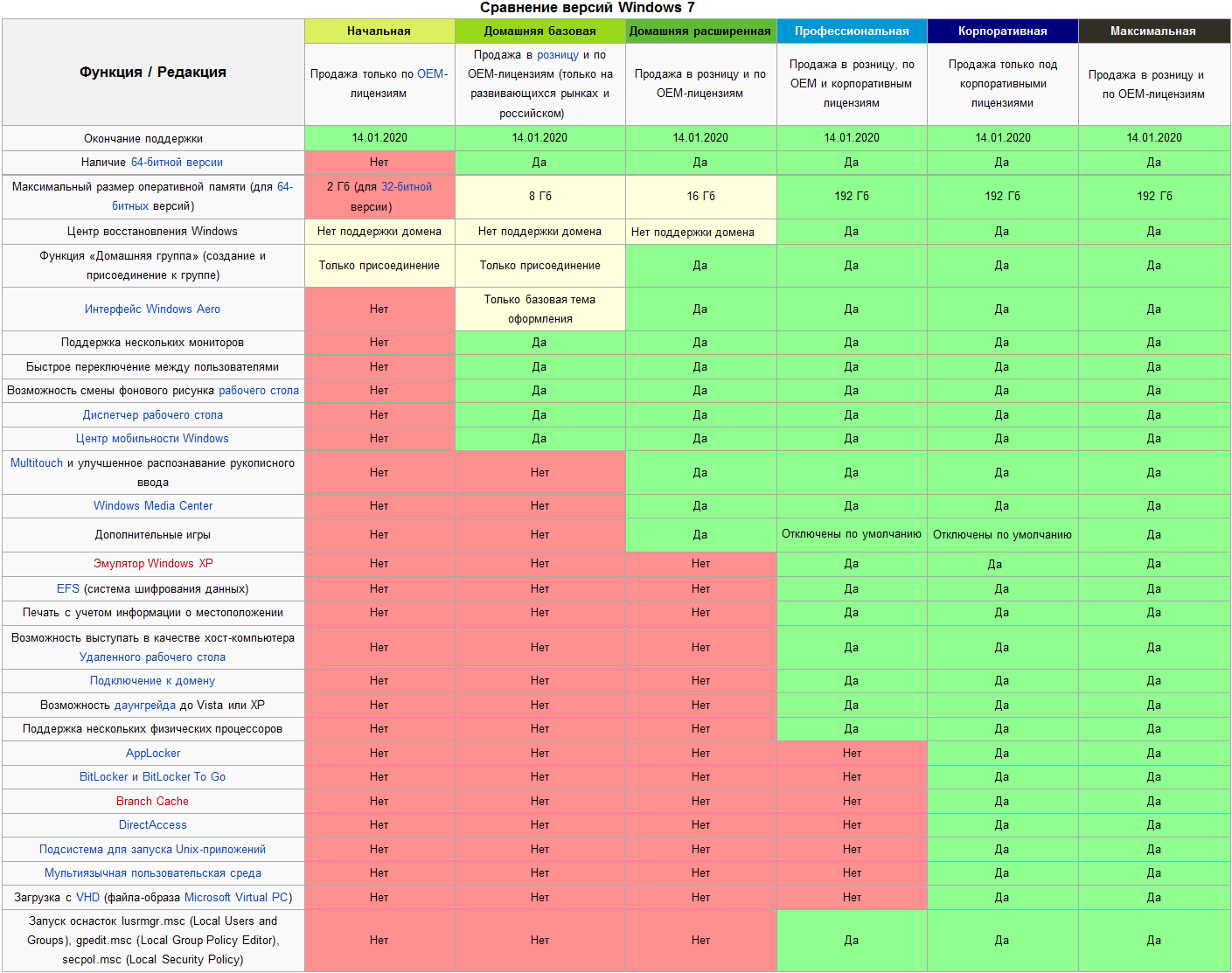 Сравнение редакций Windows 7 (для увеличения нажмите на картинку)