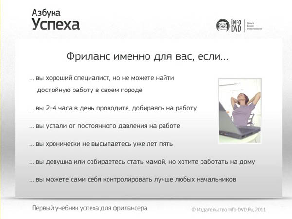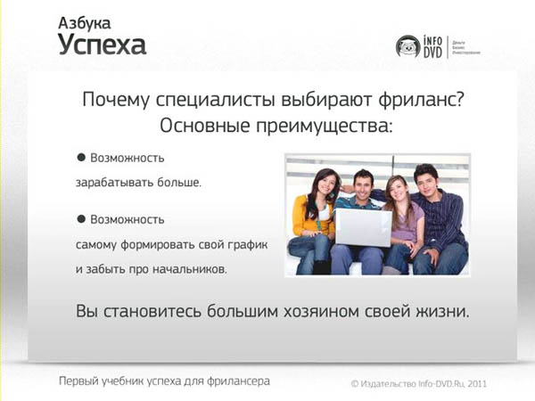 Ежели Вы желаете выяснить правду о заработках в Сети, ежели Вы желаете начать реально работать и зарабатывать в интернете, ежели Вы желаете стать фрилансером, и обязательно удачным, то бесплатный обучающий видеокурс для Вас. Это первый правдивый пошаговый видеокурс от двух удачных фрилансеров для всех, кто может и желает добиться фурора на рынке фриланса в Рунете.