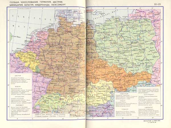 Последний советский атлас. Можно увидеть все нюансы того непростого времени. Как пример, можно указать на вариант написания города Таллинн (с двумя "н") или некую республику под названием "ССР Молдова" (на карте), которая в этом же Атласе встречается и под названием "Молдавская ССР" (в справочных данных). Германия и Йемен уже объединились, но существует ЧСФР (бывшая ЧССР).