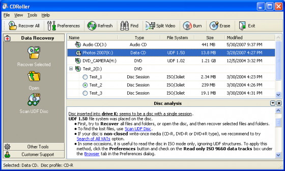 Поддерживается восстановление дисков, созданных с помощью drag and drop программ, таких как Adaptec DirectCD и Nero Burning ROM, даже записанных в мультисессии. Ищет и восстанавливает файлы на UDF-дисках. Работает с CD-DA, CD-ROM, CD-WO, CD-ROM XA, Mixed-Mode CD, Stamped Multisession CD, DVD-ROM, DVD-R, DVD-RW, DVD+R, DVD+RW.