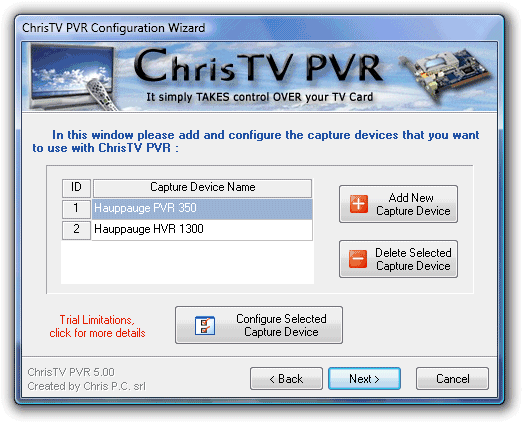 -- Prefilter Settings for Hauppauge PVRs, ATI Theater 550/650, Conneant Falcon, Conneant Blackbird TV cards Improve image quality and sharpness. -- Scheduler Module ChrisTV PVR will record your favorite movies unattended. You can leave your PC in Standby/Hibernate Mode and ChrisTV PVR will wake your PC and record your shows.