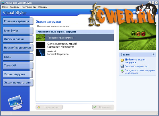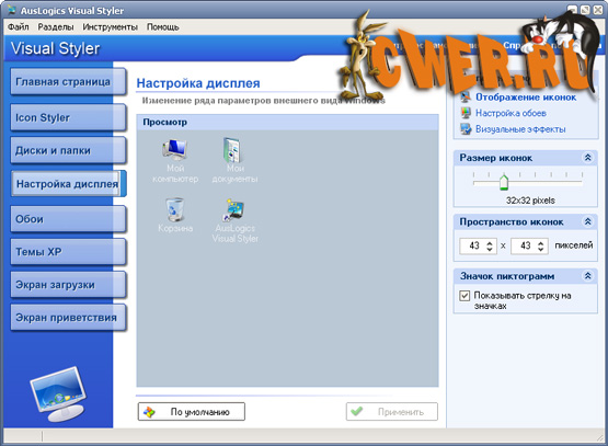 Преобразите свой Рабочий стол с помощью Visual Styler! Эта программа дает Вам шанс полностью изменить внешний вид Рабочего стола с помощью множества мощных инструментов. Забудьте про унылый выбор тем, что предоставляет Вам Windows, и разнообразьте внешний вид системы с помощью сотен новых тем, созданных другими людьми. Вы можете быть уверены, что найдете именно то, что вам нужно. С помощью простых и удобных средств вы сможете изменить более 80 системных и множество других иконок; использовать новые темы и стили для Windows XP, заменить скучный экран загрузки и настроить экран приветствия с помощью сотен тем, доступных теперь в интернете. Программа содержит другие интересные функции, такие как управления обоями, возможность создания своих пакетов иконок, автоматическая смена обоев при загрузке Windows и Мастер поиска элементов оформления с последующей автоматической установкой.