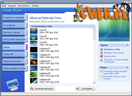 - автоматическая смена обоев при каждой загрузке системы;