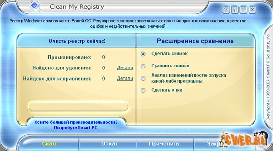 Реестр Windows важная часть Вашей ОС. Регулярное использование компьютера приводит к возникновению в реестре ошибок и недействительных значений. Clean My Registry предназначен для очистки реестра Вашего компьютера, а также для наблюдения за реестром. Вы можете сделать снимок реестра на определенную дату, отследить изменения, вносимые другими программами и многое другое!
