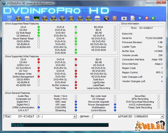 Новая версия DVDInfoPro - утилиты для тестирования и получения подробной информации о CD/DVD-приводах. Кроме этого, DVDInfoPro позволяет тестировать установленные в привод CD и DVD, а также быстро стирать и форматировать диски DVD-R/RW и DVD+R/RW. Поддерживаются практически все виды приводов, включая DVD+R DL (Double Layer).