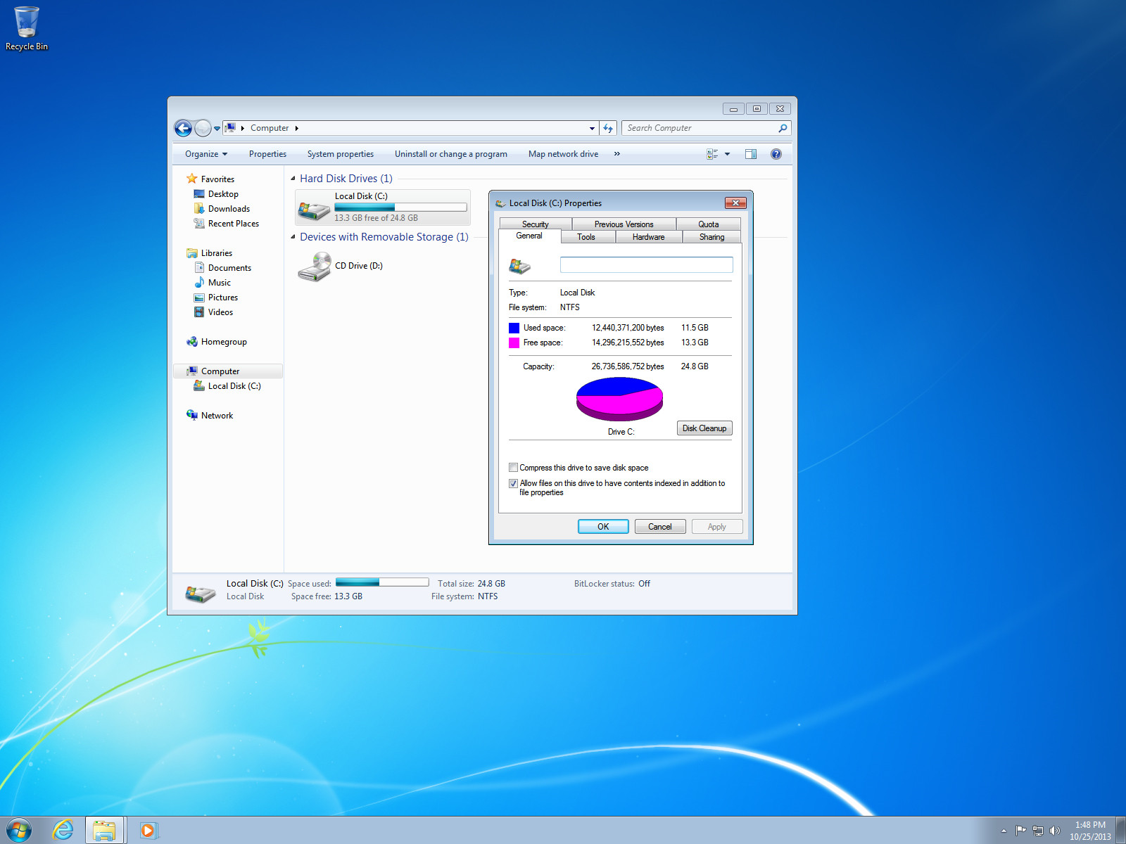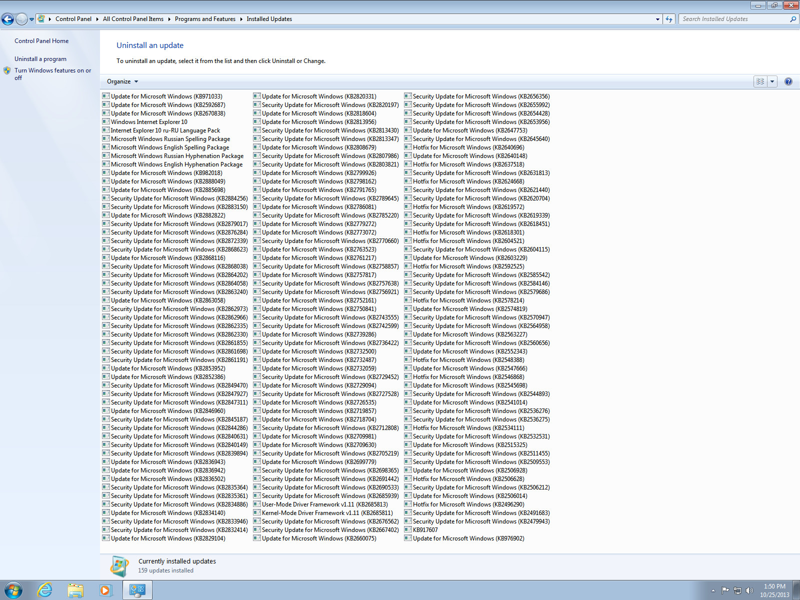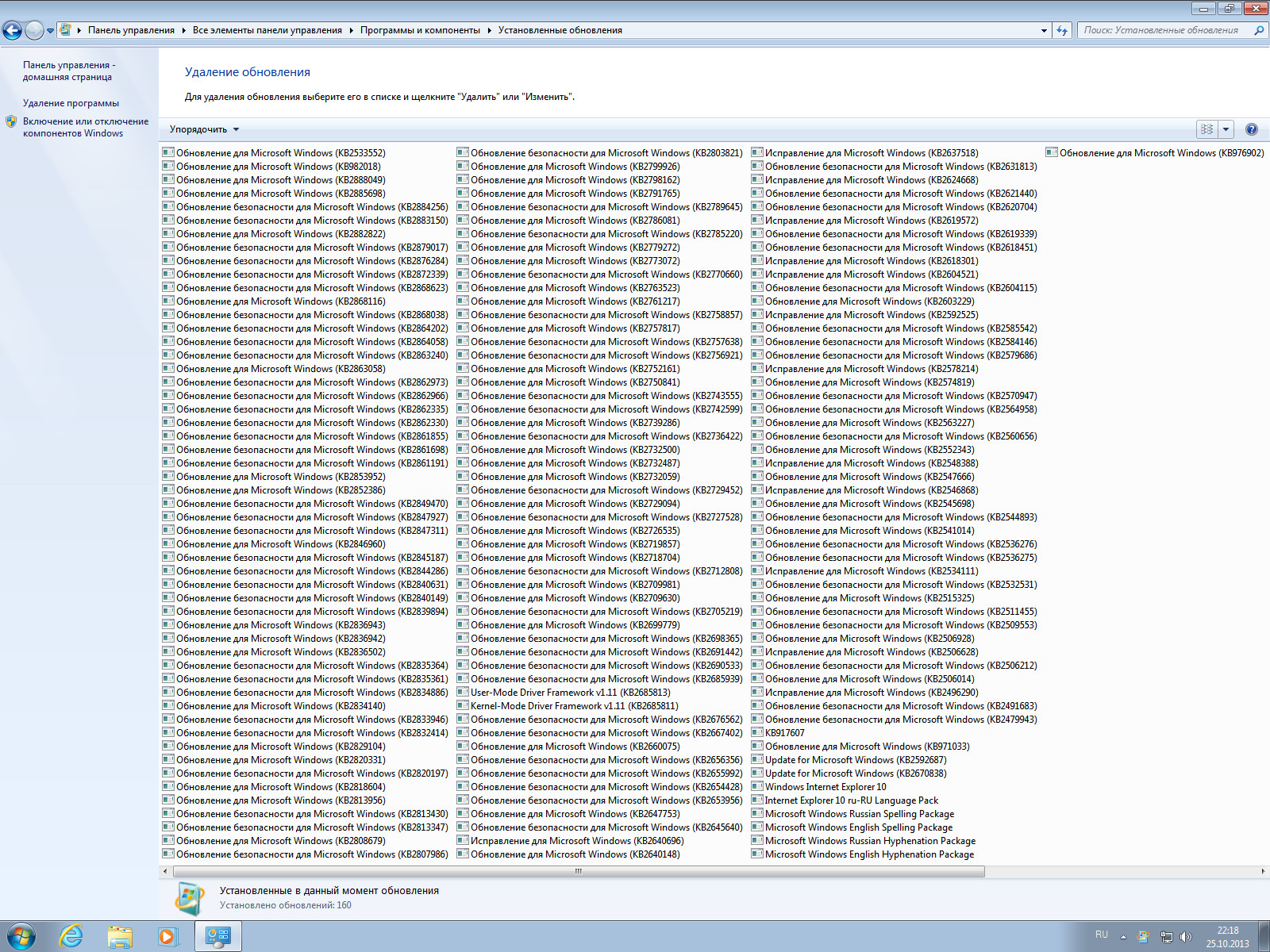 Выбор языка Рабочий стол Свойства диска Установленные обновления Internet Explorer