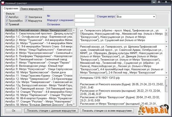 - Наземный транспорт: поиск пути между заданными пунктами, в том числе с пересадками, справочник по маршрутам.