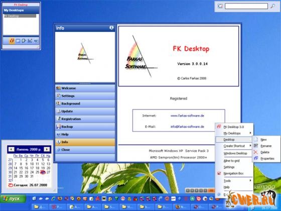 FK Desktop используется как рабочий стол Windows: двойным щелчком Вы запускаете приложения или архивы, щелканием правой кнопкой мыши - открывается контекстное меню с полезными командами. Каждый созданный рабочий стол может иметь свое собственное фоновое изображение или просто различную гамму цветов.