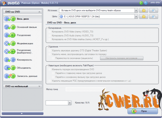 DVDFab Platinum – мощный, многофункциональный программный продукт для копирования DVD дисков с возможностями гибкой обработки видеопотока. Программа является одной из лучших на сегодняшний день, из инструментов для копирования, разбиения, пережатия и конвертирования DVD дисков с фильмами. Снимает все защиты и ограничения с диска и при желании пережмет диск большой емкости и вместит его в обыкновенную пустую DVD болванку с минимальными потерями качества (DVD9->DVD5) или разобъет фильм на два диска с полным переносом его меню, удалит всю рекламу, запишет только фильм и многое другое. Программа имеет интуитивно понятный, мультиязычный интерфейс включая русский.