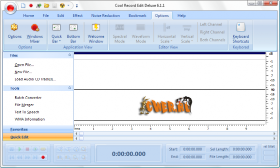 Cool Record Edit - звуковой редактор, который поможет вам перевести ваши пленки, пластинки, живые концерты, интернет-радио и любые источники звука на ваш жесткий диск. Имеются множество фильтров и большое колличество различных звуковых эффектов. Всего лишь выберите источник звука, требуемое качество записи, громкость и начинайте запись. Редактор позволяет выполнять различные операции со звуковыми данными, имеются множество фильтров и большое колличество различных звуковых эффектов. Для удобства использования так же имеется встроенный CD-риппер.