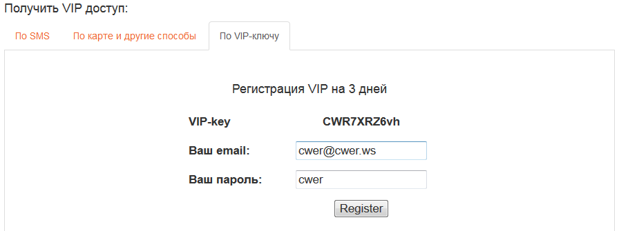 - На открывшейся страничке регистрации VIP-аккаунта укажите ваш e-mail и желаемый пароль.
