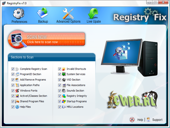RegistryFix выявляет и устраняет ошибки в системном реестре Windows, причем делает это очень хорошо, и без необходимости перезагрузки компьютера для того, чтобы изменения вступили в силу. Список областей очистки реестра довольно широк: - программная область, - установка/удаление программ, - установленные шрифты, - совместно используемые файлы, - файлы помощи, - область автозагрузки программ, - системные сервисы и драйвера - ярлыки и т.д. Перед началом процесса чистки можно сделать резервную копию реестра.