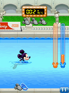 Игра для мобильных телефонов. Помоги Гуфи, Микки, Минни и Дональду победить и получить золотые медали в спортивных соревнованиях мирового класса. Неуклюжему Гуфи предстоит преодолеть 400- метровую трассу с препятствиями и не упасть. Минни покажет свое умение держать равновесие на бревне и восхитительную осанку. Микки продемонстрирует свое мастерство пловца в соревнованиях по плаванию, а Дональд покажет высший класс в прыжках в воду! Удобное управление делает эту игру легкой и увлекательной, но, чтобы побить мировые рекорды, вам придется попотеть. Размеры экранов: 128х128, 128х160, 176х208, 176х220, 240х320.